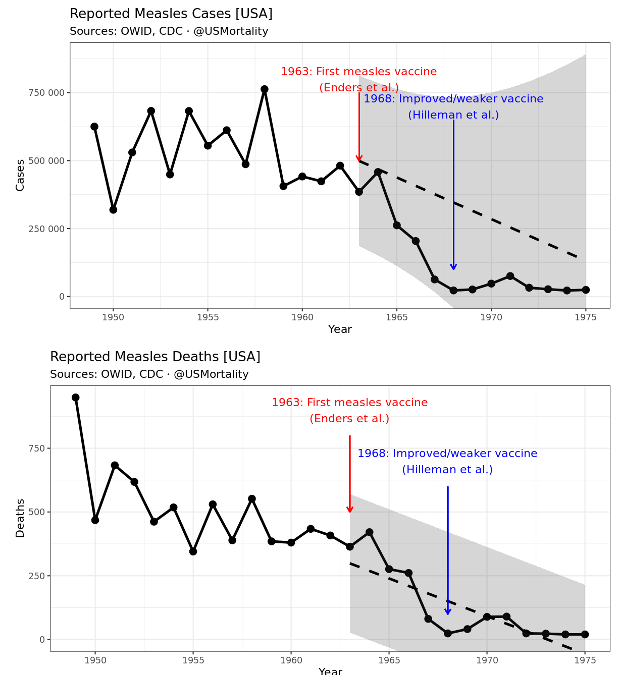 After vaccination, deaths dropped to nearly zero. However, proving causality would require long-term placebo-controlled trials. Charting the pre-vaccination trend from 1949 to 1962 shows that both cases and deaths followed the expected trajectory, meaning the decline might have continued without vaccination. The sharper drop in cases may be influenced by bias, as doctors and parents—assuming vaccination prevents measles—could have attributed symptoms to other causes.