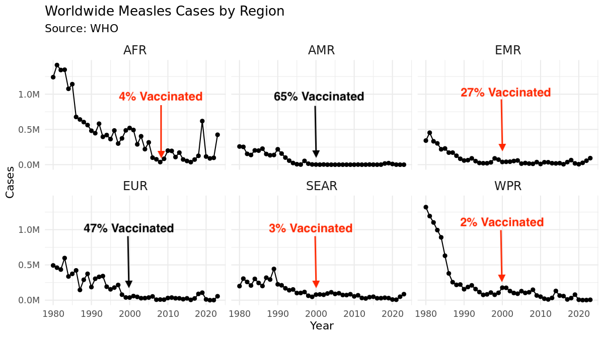As we can also observe from global epidemiological data, the decline in measles cases is very likely unrelated to vaccination rates.