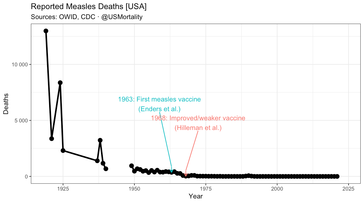 The recent headlines about the “measles outbreak” prompted me to examine the actual data. Notably, before the introduction of the first measles vaccine by Enders et al. in 1963, measles deaths had already declined by 97.2%, from 12,992 in 1919 to 364 in 1963—without vaccination.