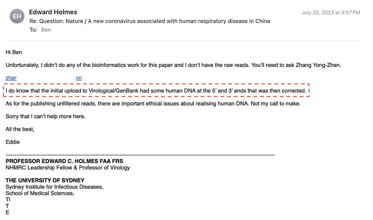 Edward Holmes - co-author of the original genome publication - confirmed that MN908947.1 contained human DNA: