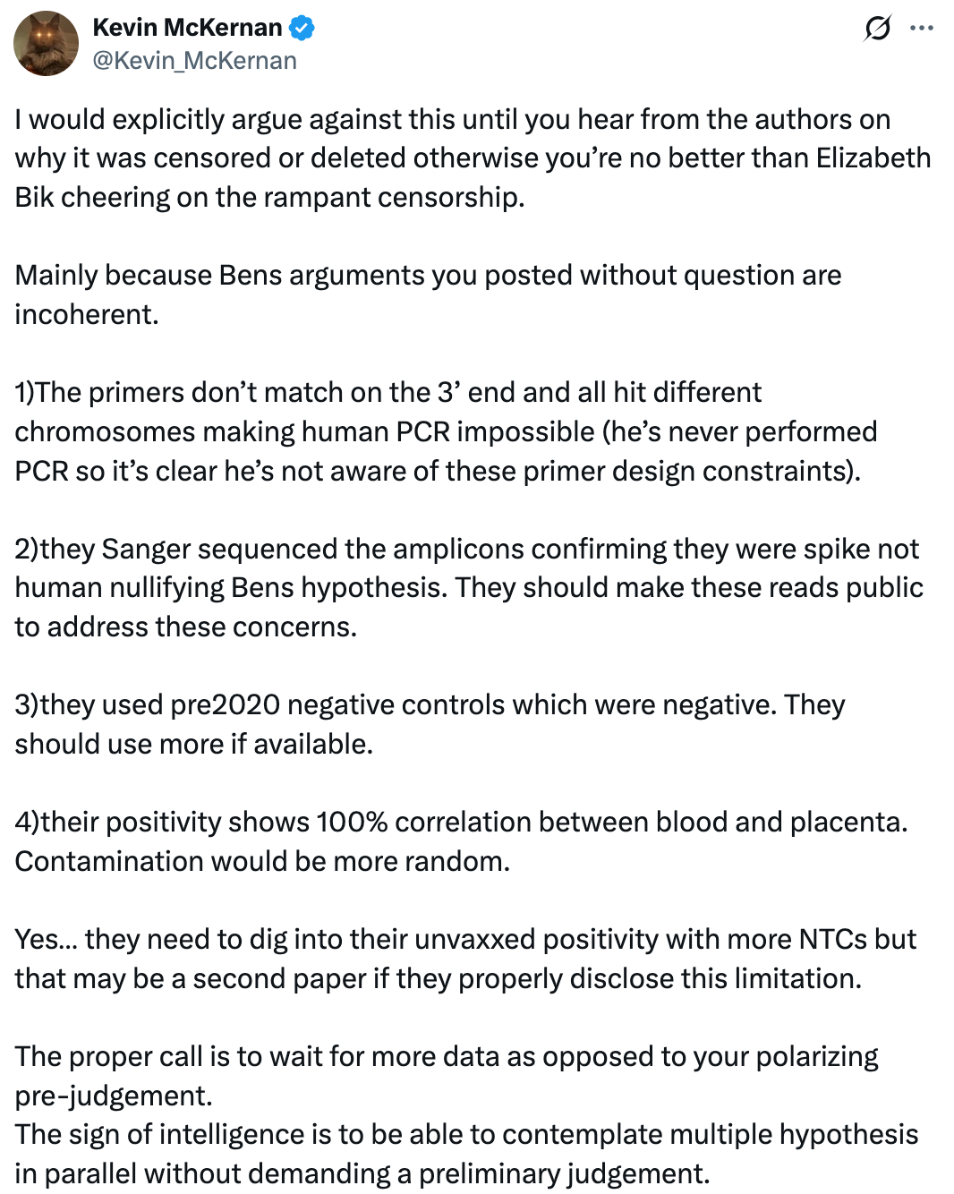 Kevin McKernan - former R&D team leader for the Human Genome Project - attempted to dismiss concerns about the study’s primers cross-reacting with human DNA.